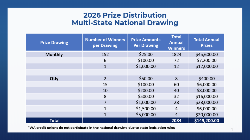 Open a 12-month Save to Win share certificate with at least $25.00. This is your first entry into that month’s drawing as well as additional drawings throughout the year. Make deposits into your share certificate each month. Every $25.00 deposit earns you an entry into the drawings, up to 10 prize entries per month.